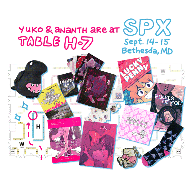 Hi everyone! We're going to be tabling at SPX 2024, our first time back since the pandemic! You can find us at table H7. We'll have lots of books, including a ton of new releases! Come say hi, it's been a minute!